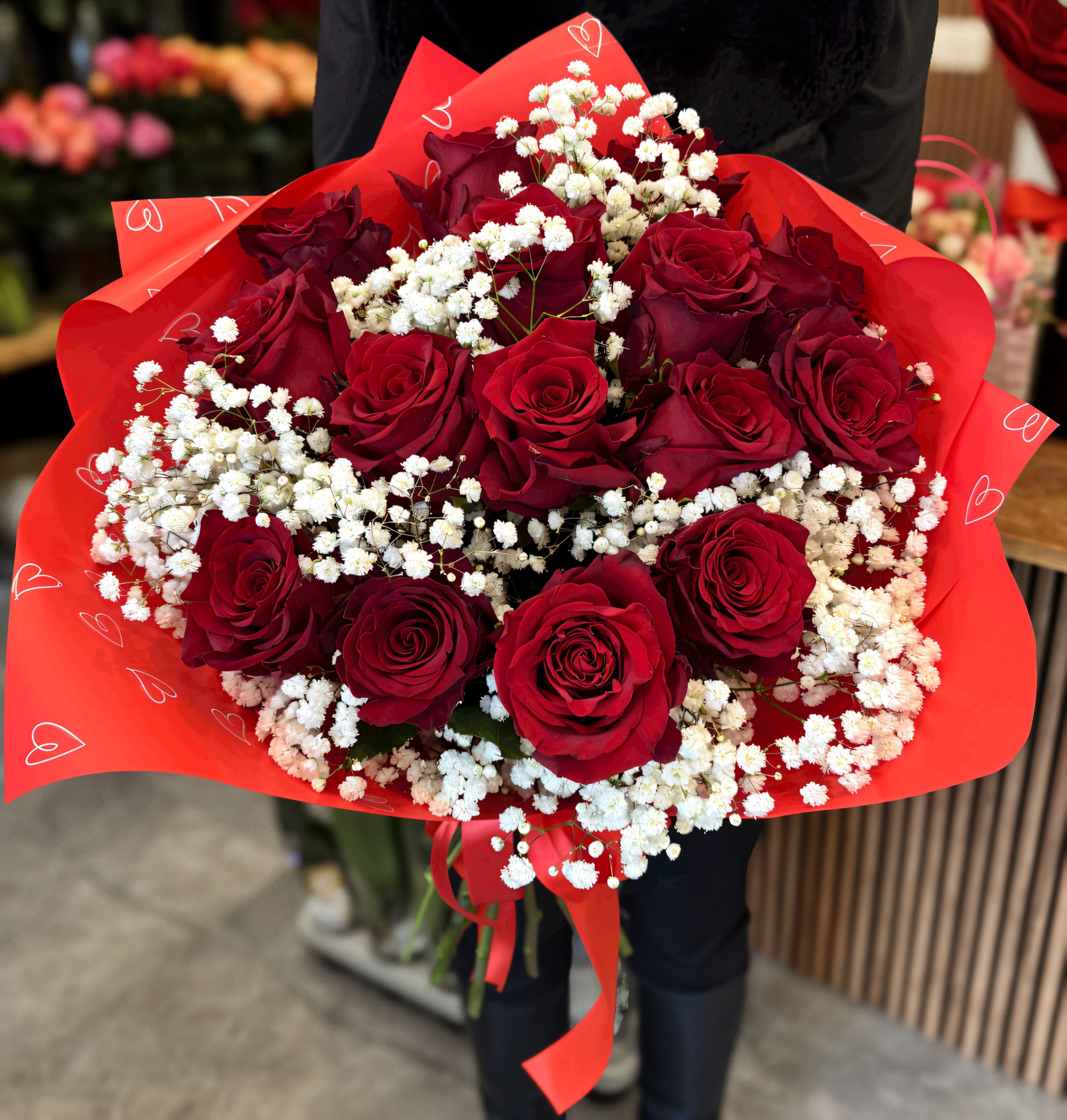Elegancki bukiet czerwonych róż otulonych delikatną gipsówką, podkreślony walentynkowym opakowaniem. Ponadczasowa propozycja, która wyraża miłość w najpiękniejszy i prosty sposób. Kolorystyka bukietu może się różnić w zależności od dostępności kwiatów.
