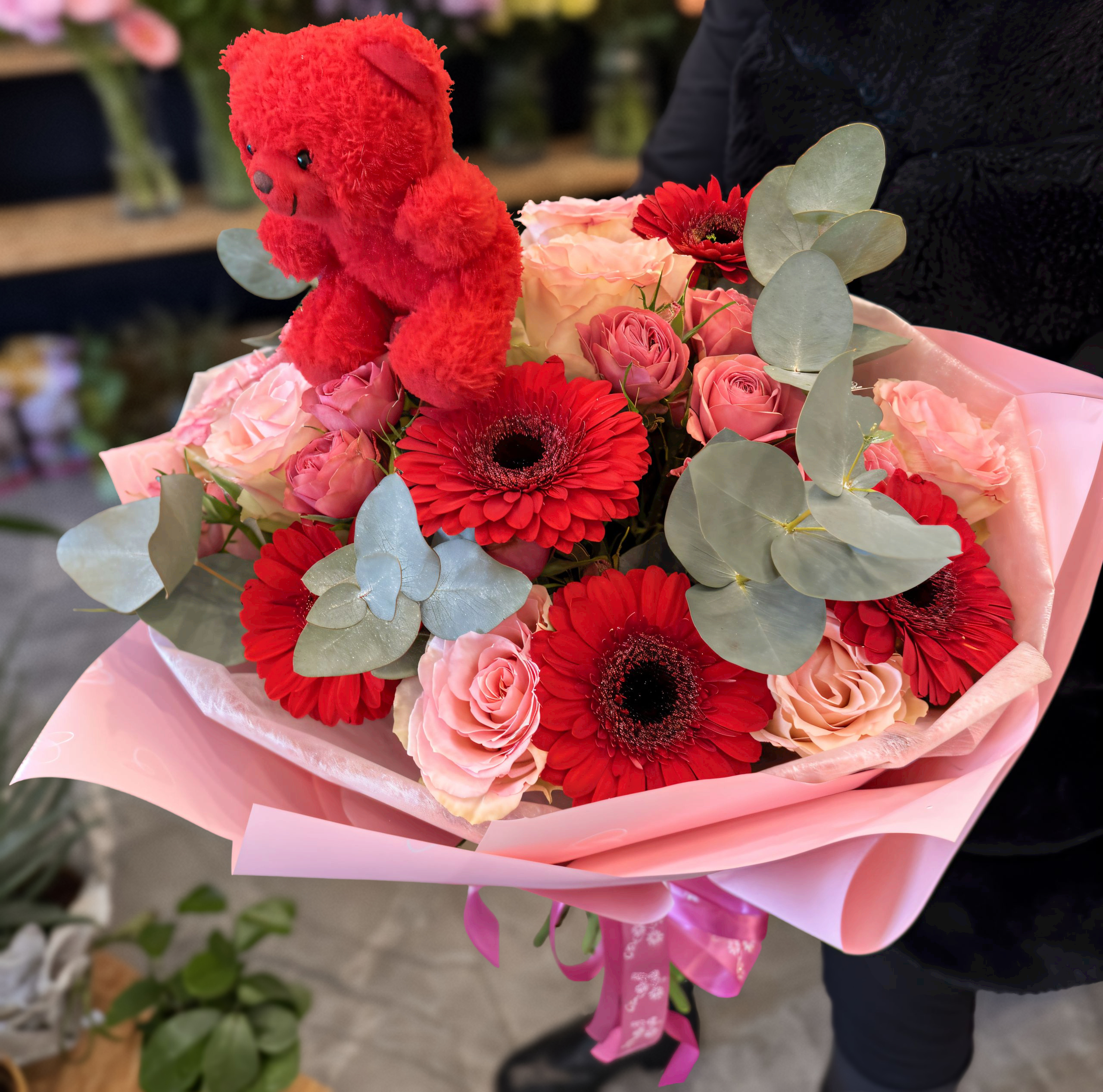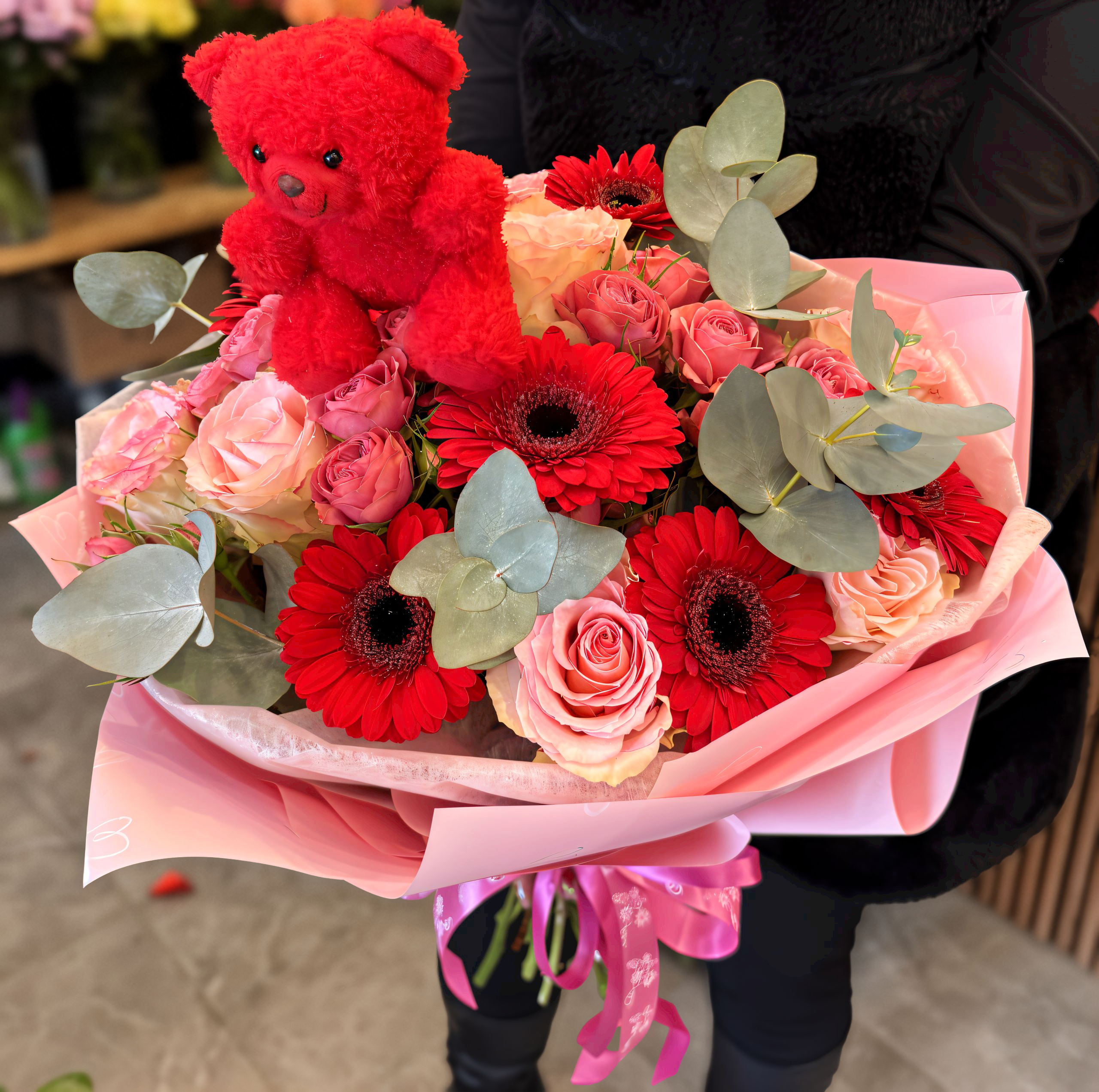 Urocza kompozycja róż i gerber w romantycznych odcieniach czerwieni i różu, wzbogacona świeżą zielenią i pluszowym akcentem. Idealny wybór, by wywołać uśmiech i podkreślić wyjątkowość chwili. Kolorystyka bukietu oraz odcień dodatków mogą się różnić w zależności od dostępności.