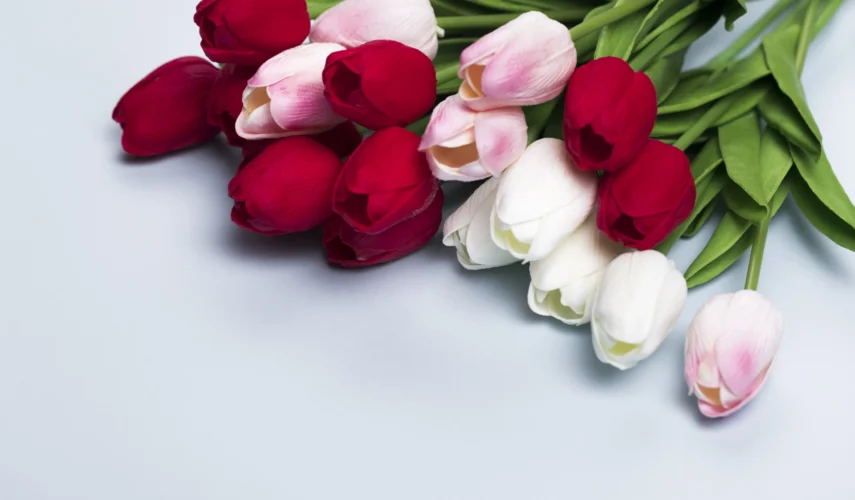 Białe tulipany, różowe róże lub mieszany bukiet w stonowanych kolorach. Liczba powinna być znacząca (15-21). Dołącz osobistą wiadomość – same kwiaty to za mało.